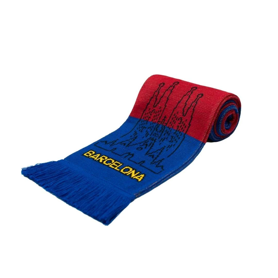 - Wzór i Kolorystyka: Klasyczne, głębokie bordowo-granatowe barwy (Blaugrana) inspirowane stylem Barcelony, z efektownym żółtym napisem „BARCELONA” oraz „Visca Catalunya”. Unikalnym detalem są zakończenia szalika, których wzór nawiązuje do charakterystycznego kształtu wież Sagrada Familia. Design podkreśla kibicowską pasję i związek z miastem.
