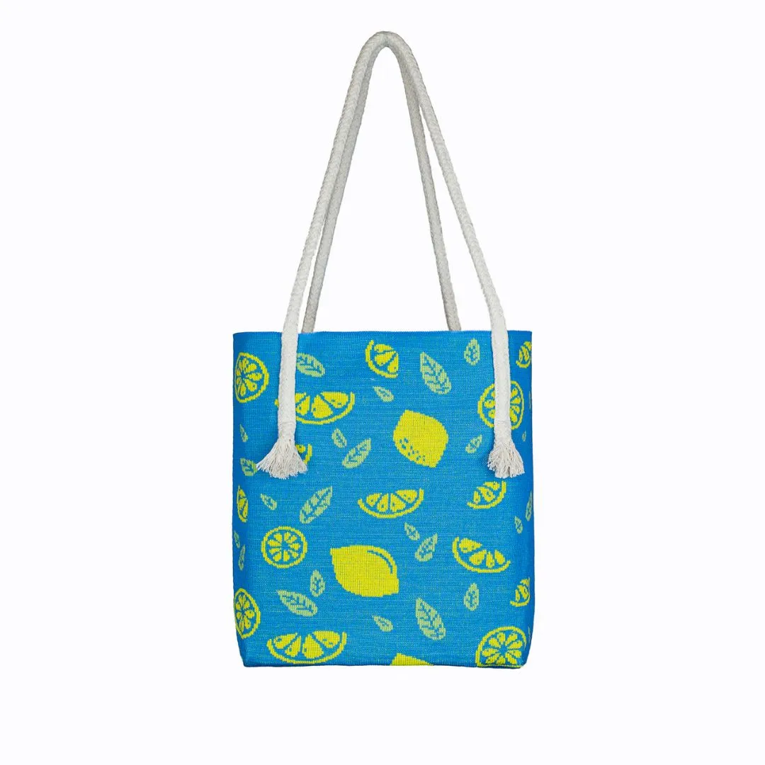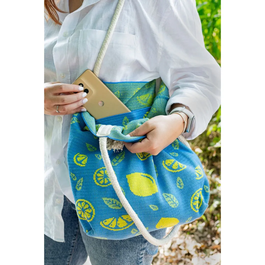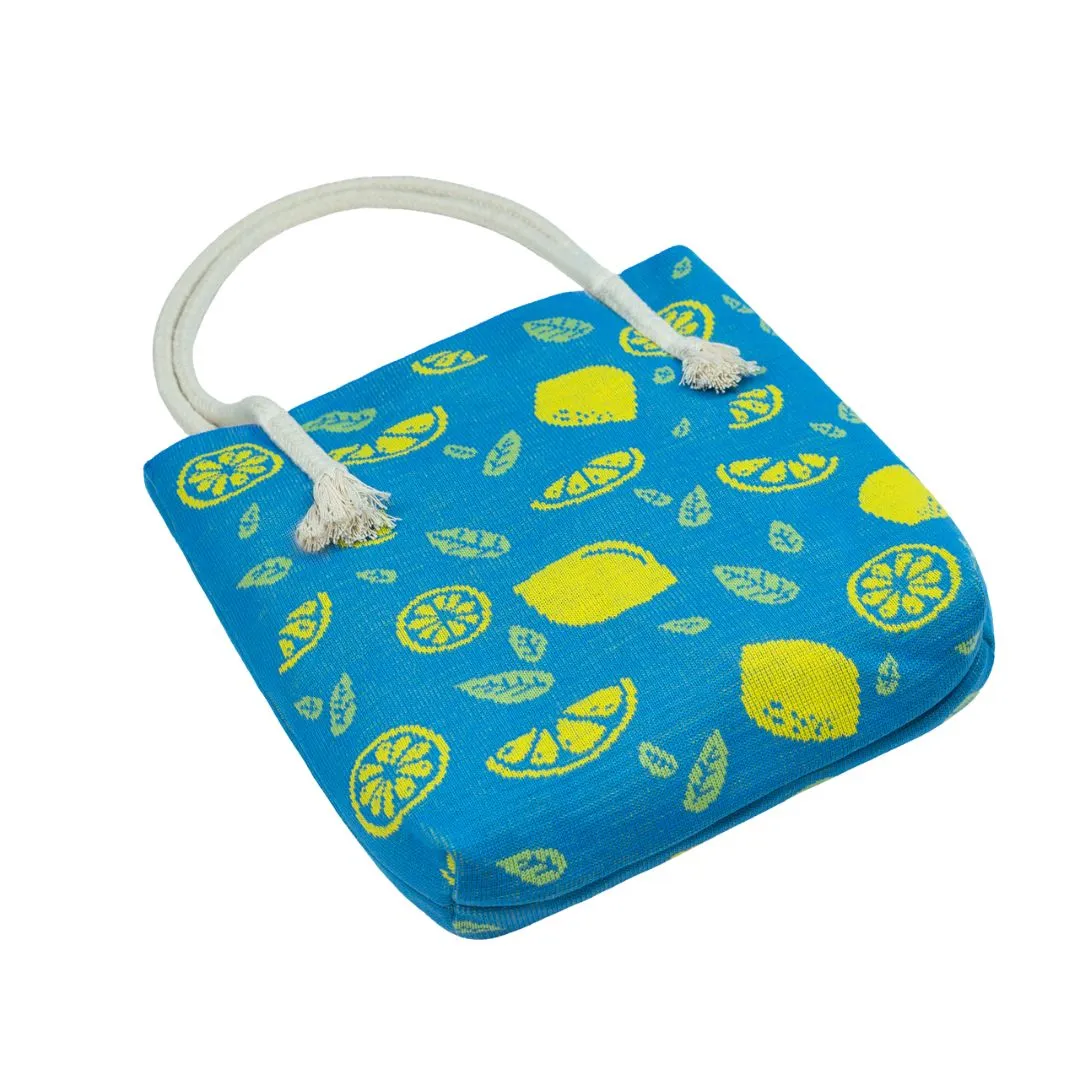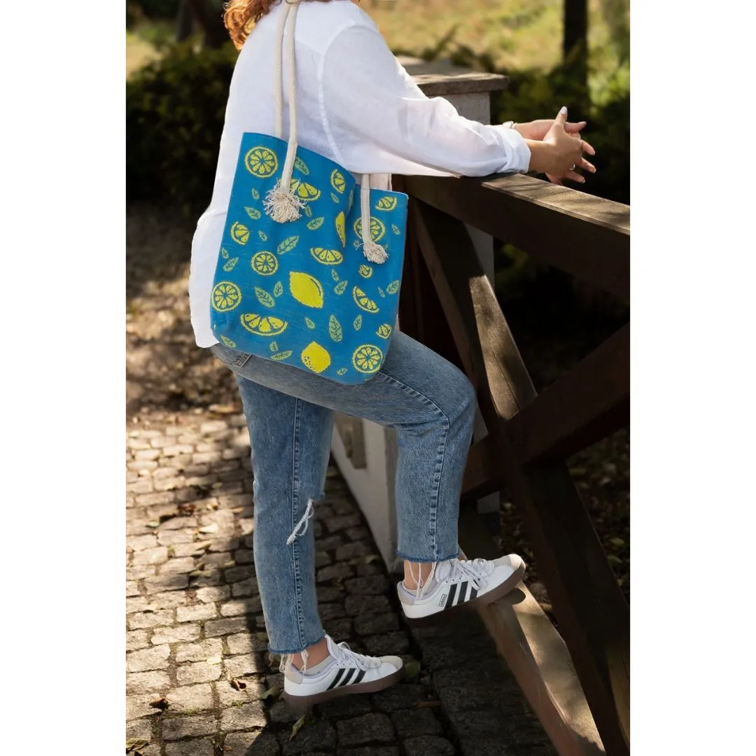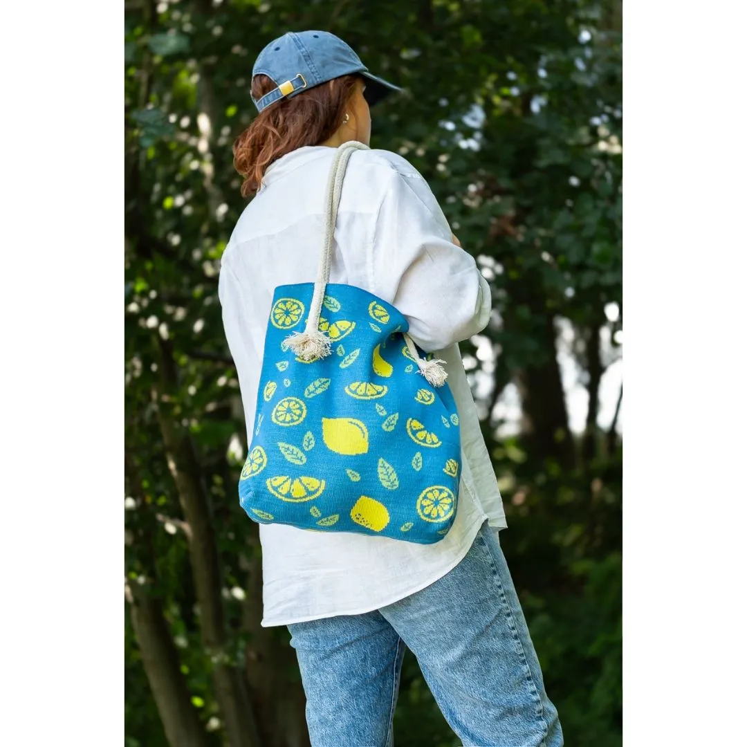Casualowa torebka dziana z plecionymi uchwytami i dwustronnym wzorem w cytryny. Wytrzymała, pojemna (mieści A4), z wewnętrzną kieszonką.