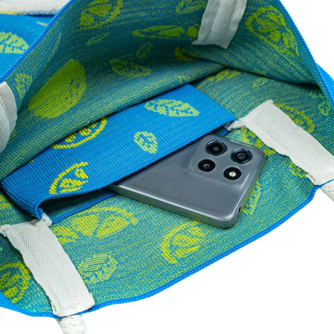 - Wzór i design: Torebka posiada dwustronny, żakardowy wzór w cytryny na niebieskim tle, który jest identyczny zarówno z przodu, jak i z tyłu.